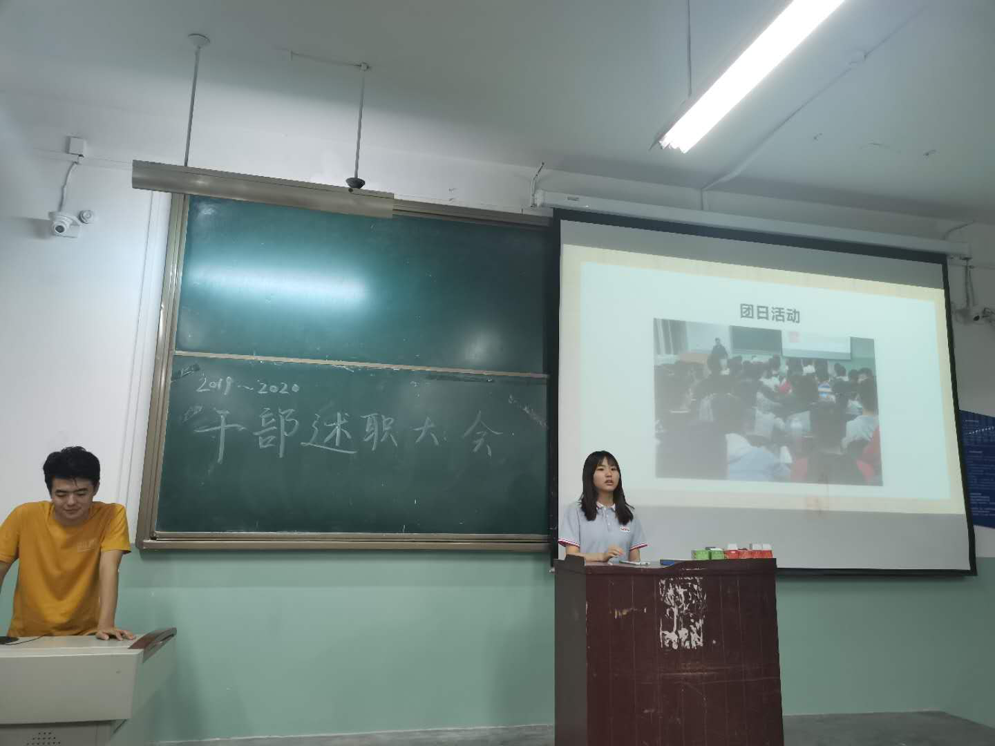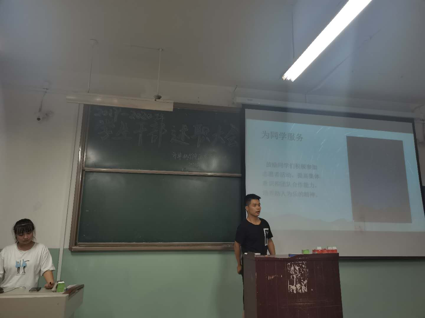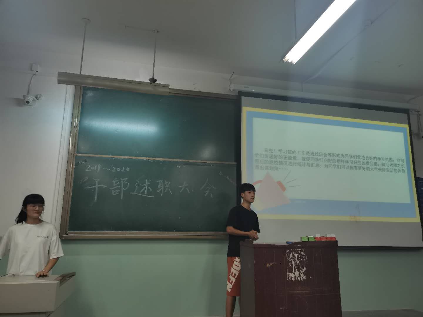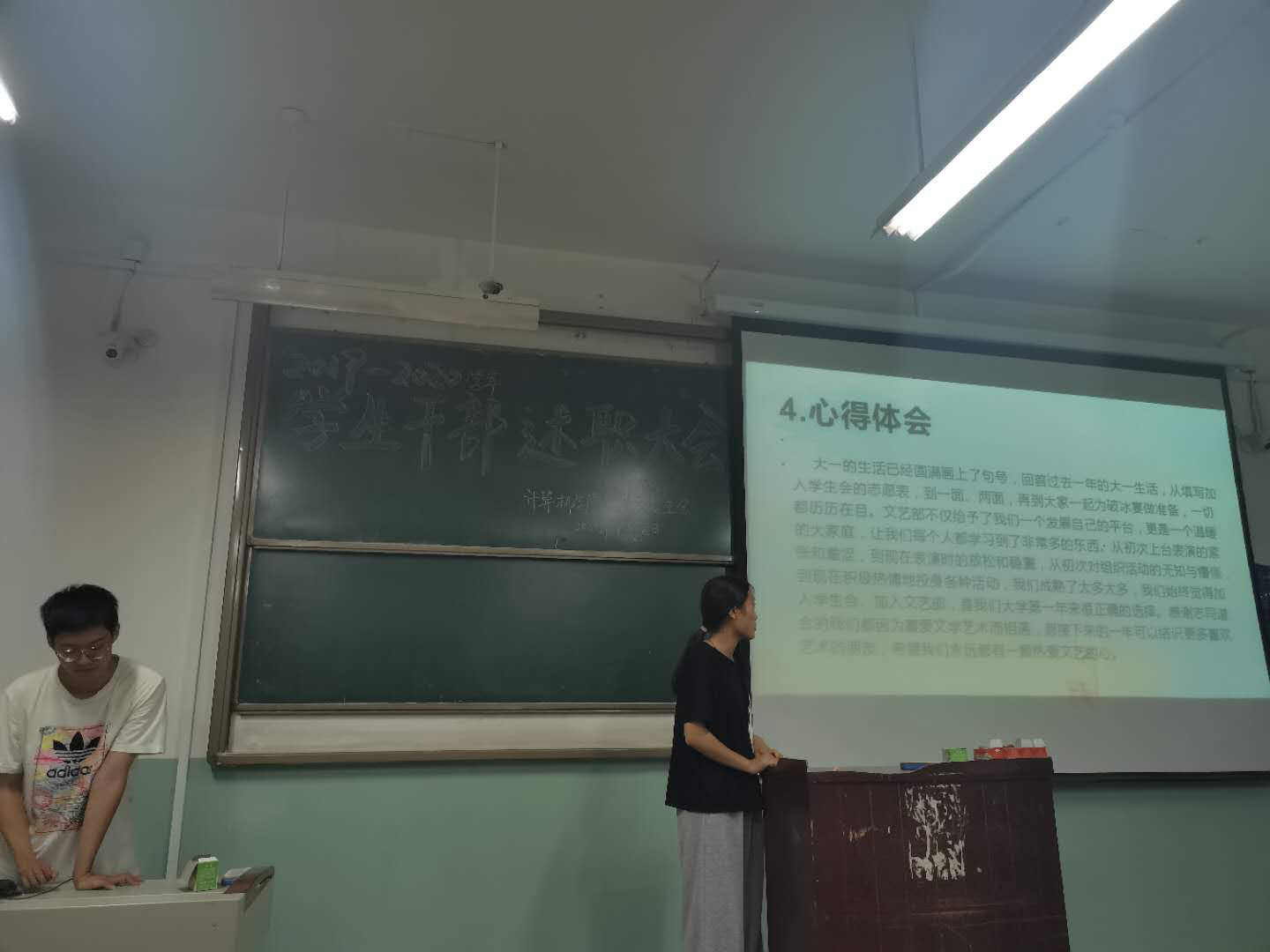 会上,大三学生干部通过PPT对各自部门工作职能、工作内容、工作体会和改进措施进行展示和讲解,讲述一年中自己的成长以及在部门中的收获。大二成员就新学期工作规划进行汇报,表达了在新学期开始,创新活动形式,更好地服务师生,履行职责,营造青春向上的团学风貌。