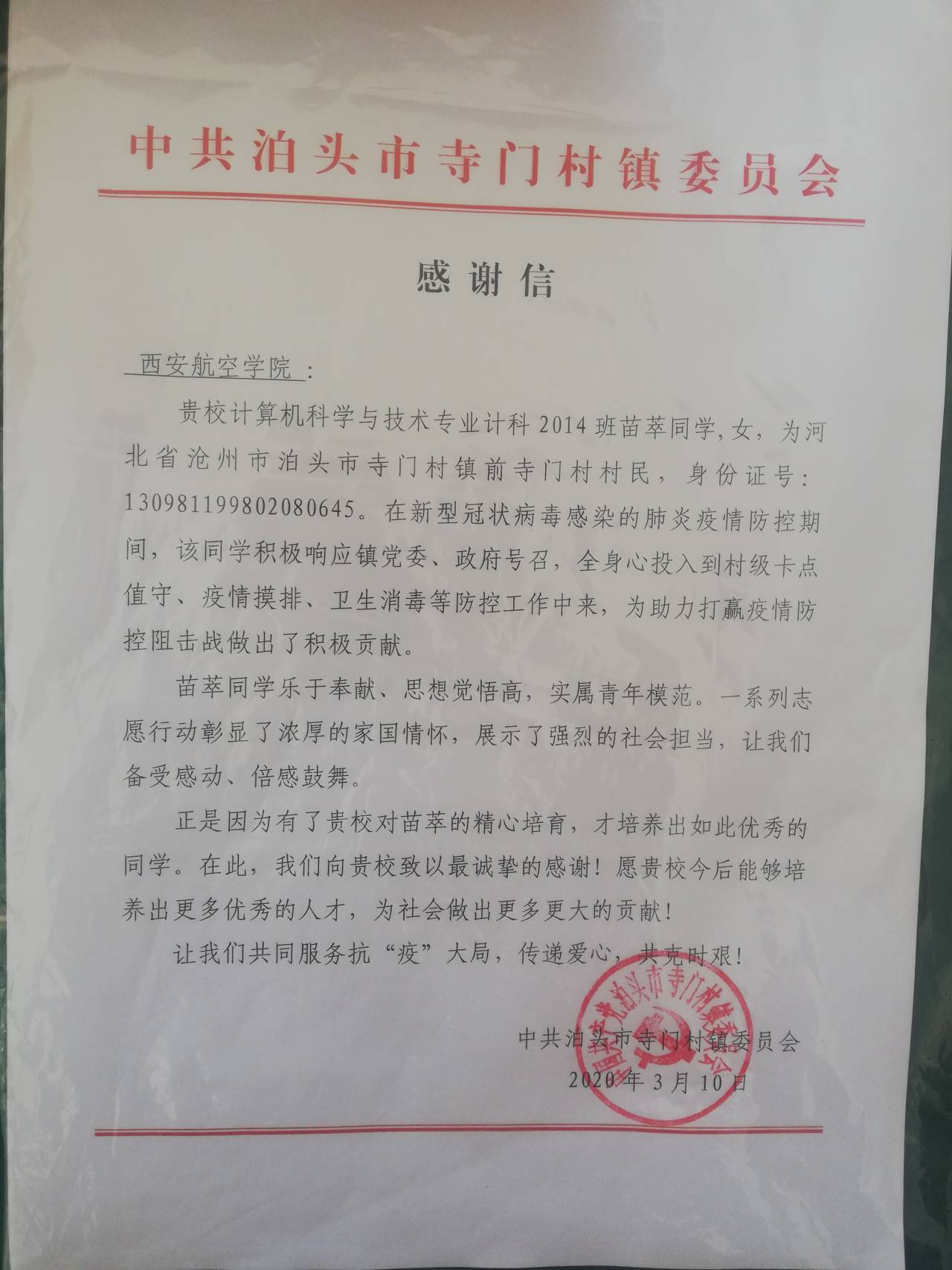 近日,ms88明升收到一封来自河北省泊头市的感谢信,信中对学院计算机科学与技术2014班学生苗萃在疫情期间乐于奉献的精神和作为志愿者的优异表现进行肯定和赞扬,并对学院培养出如此勇于担当的学子表示感谢。